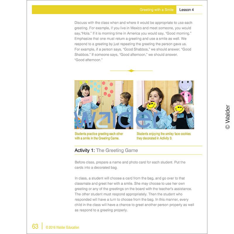 Everyone appreciates being greeted with a smile. This social skill lesson engages students with fun activities while it informs them of the importance of greeting people with a smile, and the appropriate way to do it. This is the fourth lesson of a curriculum that covers 15 social skills. Each social skill lesson includes an anticipatory set puppet show, introduction to skill, interactive activities and games, discussion, story, song, assessment, and educational aids.