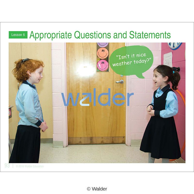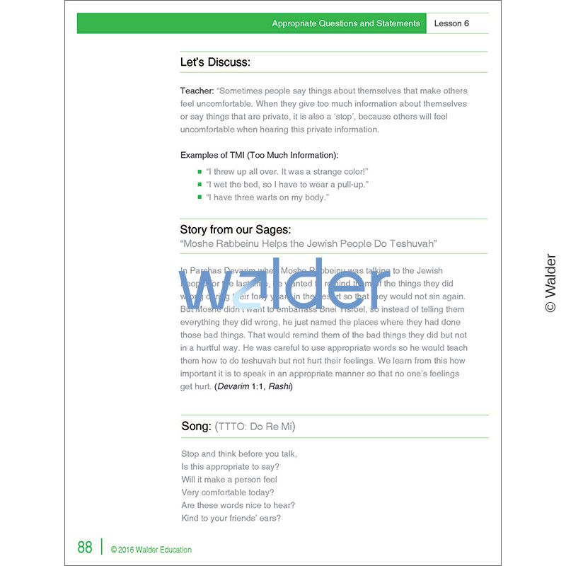 Learning to differentiate between what kinds of questions and statements are appropriate, and which are not, is an essential social skill. This social skill lesson engages students with fun activities while it teaches them that asking or saying something that makes people sad or uncomfortable is wrong. It shows them how to question and comment appropriately. This is the sixth lesson of a curriculum that covers 15 social skills. Each social skill lesson includes an anticipatory set puppet show, introduction to skill, interactive activities and games, discussion, story, song, assessment, and educational aids.