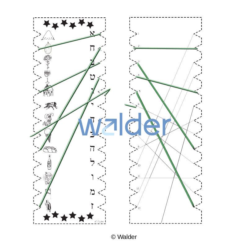 A super way for your students, especially your kinesthetic learners, to test and check their knowledge independently! Students will wrap a string around the Smart String card to “draw” a line from a letter of the Alef-Beis to a picture of a word which begins with that letter. By turning over the card and checking whether the string covers all of the lines on the back, students can see how well they did!