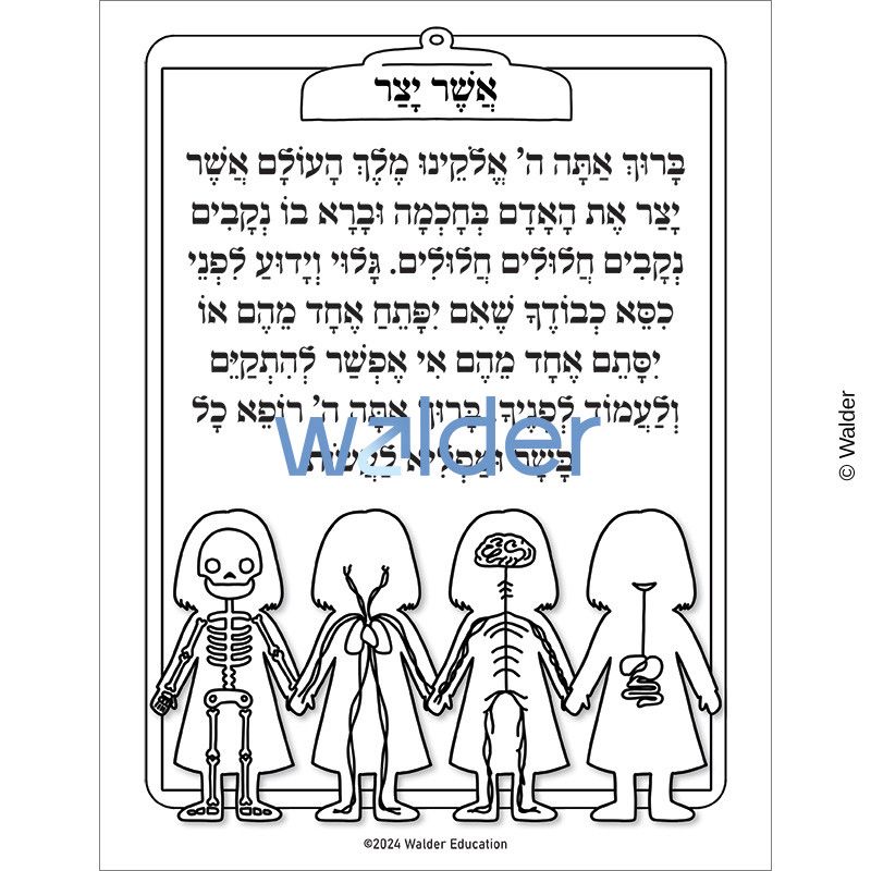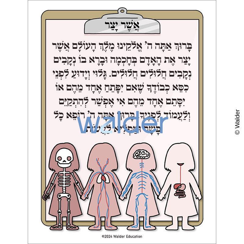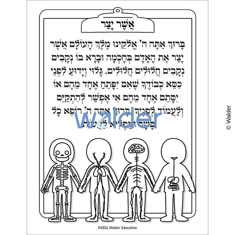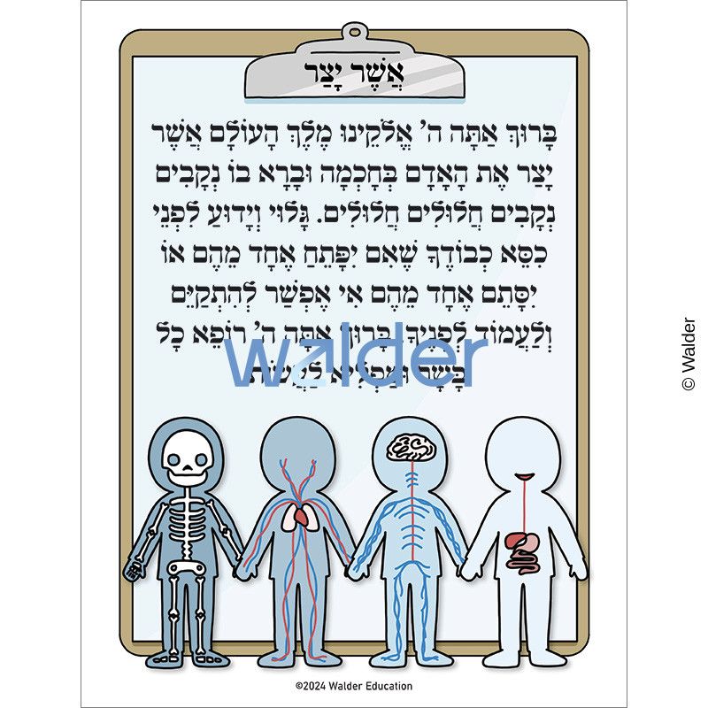 Encourage students to recite Asher Yatzar with this illustrated sign that includes the full Hebrew text of the brachah in an easy-to-read font with nekudos. The engaging illustrations of 4 major systems of the human body— skeletal, pulmonary, nervous, and digestive—exemplify the wondrous functions that Hashem has given the human body. Place the sign where it can be easily seen and remind students that looking at the words while reciting Asher Yatzar aids in kavanah, especially important when we thank Hashem for our continued good health.