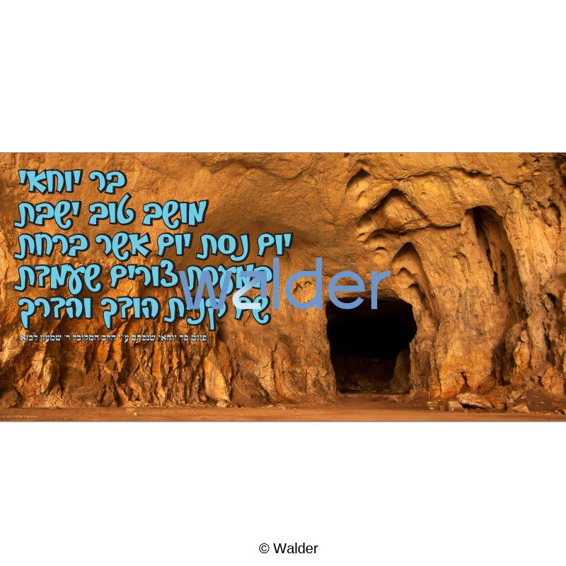 A school-wide banner with a picture of the opening to a cave and a stanza from the Piyut (song/poem) “בר יוחאי” sung on ל”ג בעומר about how ר’ שמעון בר יוחאי hid in a cave. The cave is not the one that ר’ שמעון בר יוחאי hid inside, rather just a visual to bring out the idea.