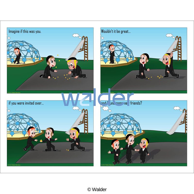 This ‘Be a Friend’ poster will encourage Ahavas Yisrael, empathy, compassion, and chesed in your students. The characters model considering others’ feelings and including others in daily social activities. Use the poster’s story to have your students present the thoughts and feelings of each of the children depicted on the poster, and discuss ways that each child benefits in the end.