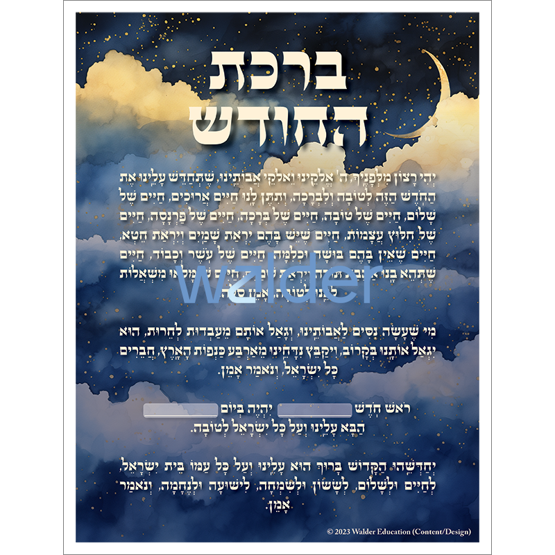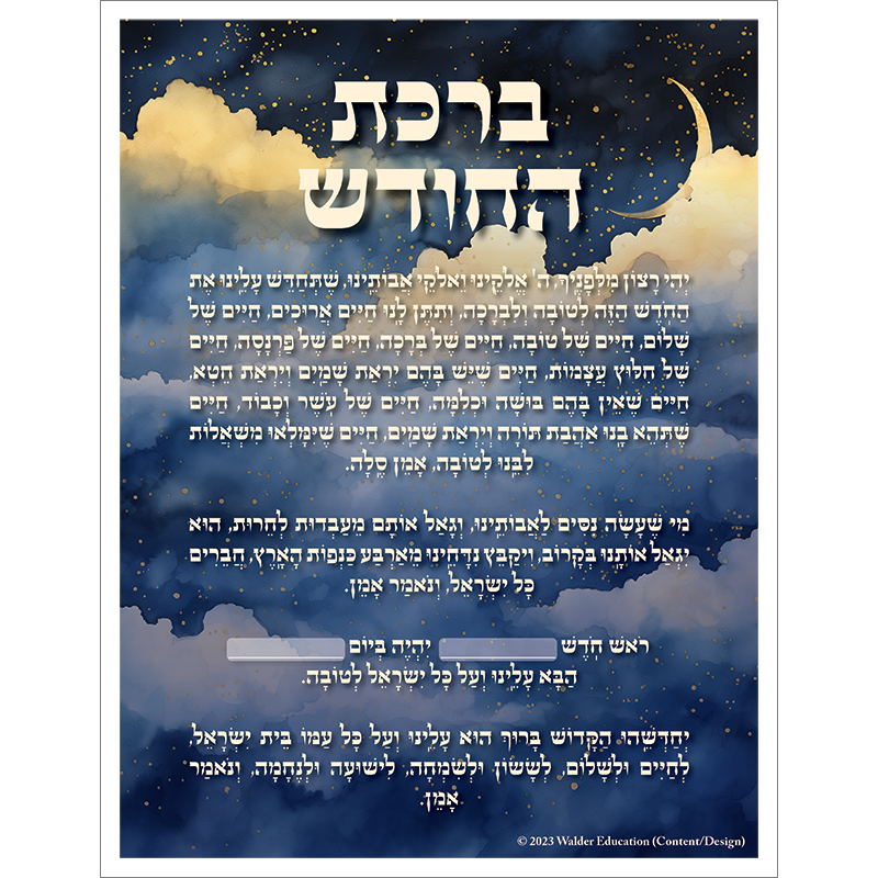 Prepare your students for Rosh Chodesh with this sign featuring the complete Hebrew text of Birkas Hachodesh according to Nusach Ashkenaz. This prayer announcing the new month is recited in synagogue on the Shabbos before each Rosh Chodesh. Students can fill in the blank lines provided with the name of the new month and the day or days when Rosh Chodesh will fall during the coming week.