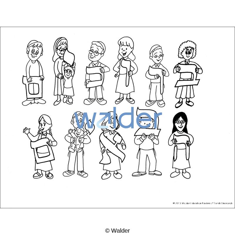 Illustrated boys and girls each holding up one letter to form the words “Bruchim Habaim’ in English. Possible Uses: 1. Teachers will hang on the door of the classroom to welcome students. 2. Students will color this handout to make a quick and inexpensive sukkah decoration. Optional: Laminate
