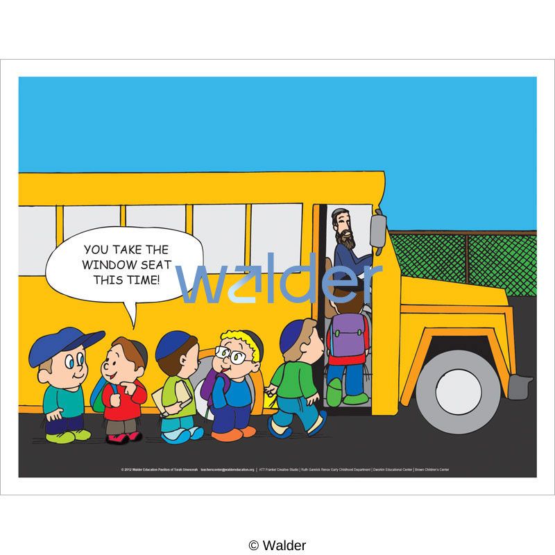 Poster featuring a picture of two boys on a purple rug full of toy vehicles, one boy is handing the other boy a green truck that says ‘Best Truck’ on it. A speech bubble coming from the first boy reads ‘I think you’ll like playing with this truck!’.