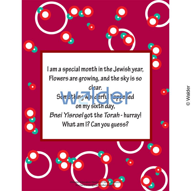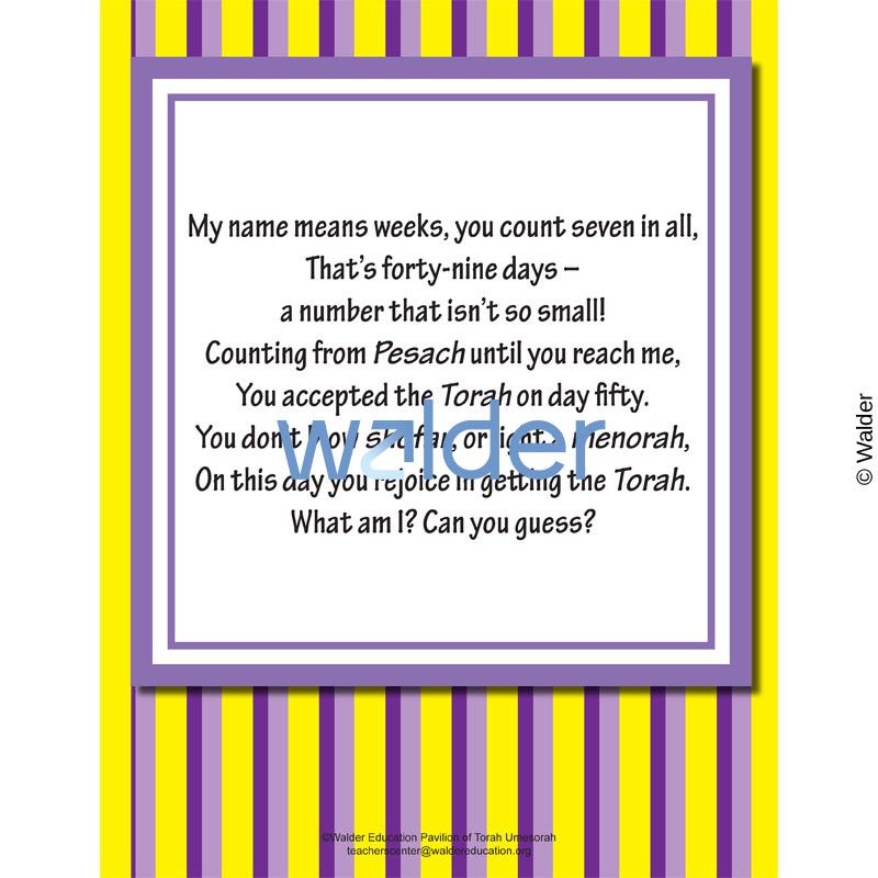 | Goals and Objectives: | Students will learn and review many important concepts of Shavuos by listening to or reading the rhymes and guessing what or who they are referring to. |