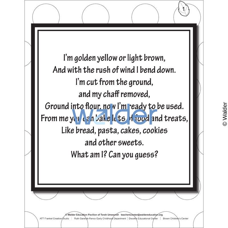 | Goals and Objectives: | Students will learn and review many important concepts of Shivas Haminim by listening to or reading the rhymes, coloring the pictures and guessing what or who they are referring to. |