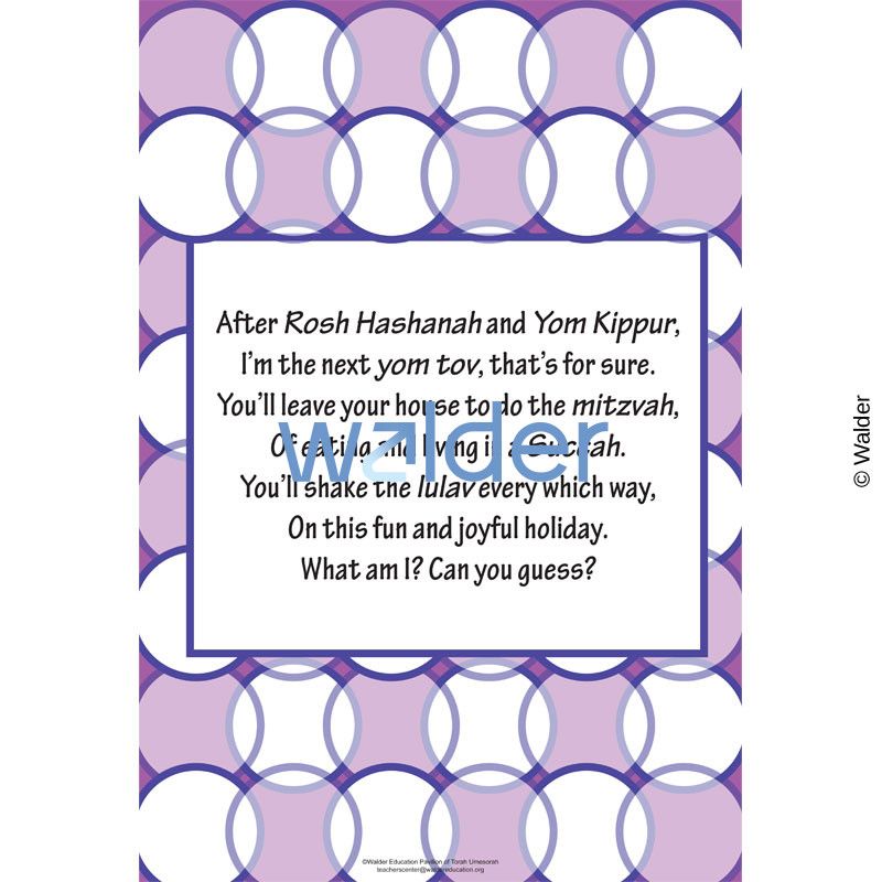 Goals and Objectives: Students will learn and review many important concepts of Succos by listening to the rhymes and guessing what or who they are referring to.