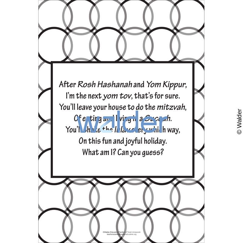| Goals and Objectives: | Students will learn and review many important concepts of Sukkot by listening to the rhymes and guessing what or who they are referring to. |