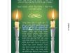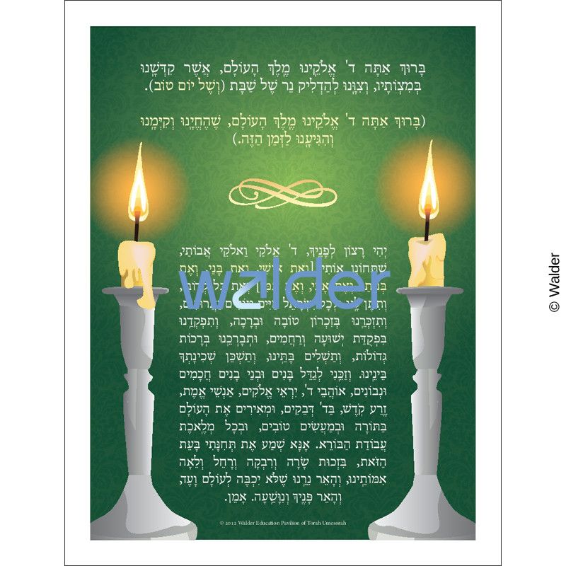 Sign featuring two shabbos candles in silver candlesticks on a textured green background. The brachah for candle lighting is at the top and yehi ratzon is between the two candlesticks.
