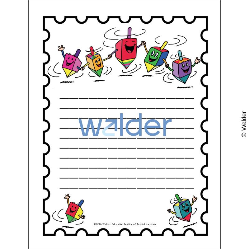 Lined paper illustrated with cartoon dancing dreidels. Possible Uses: 1. Distribute to students and encourage them to use for note taking in their Chanukah binder. 2. Write notes regarding Chanukah to parents on these papers. 3. Use as blank coloring sheets.