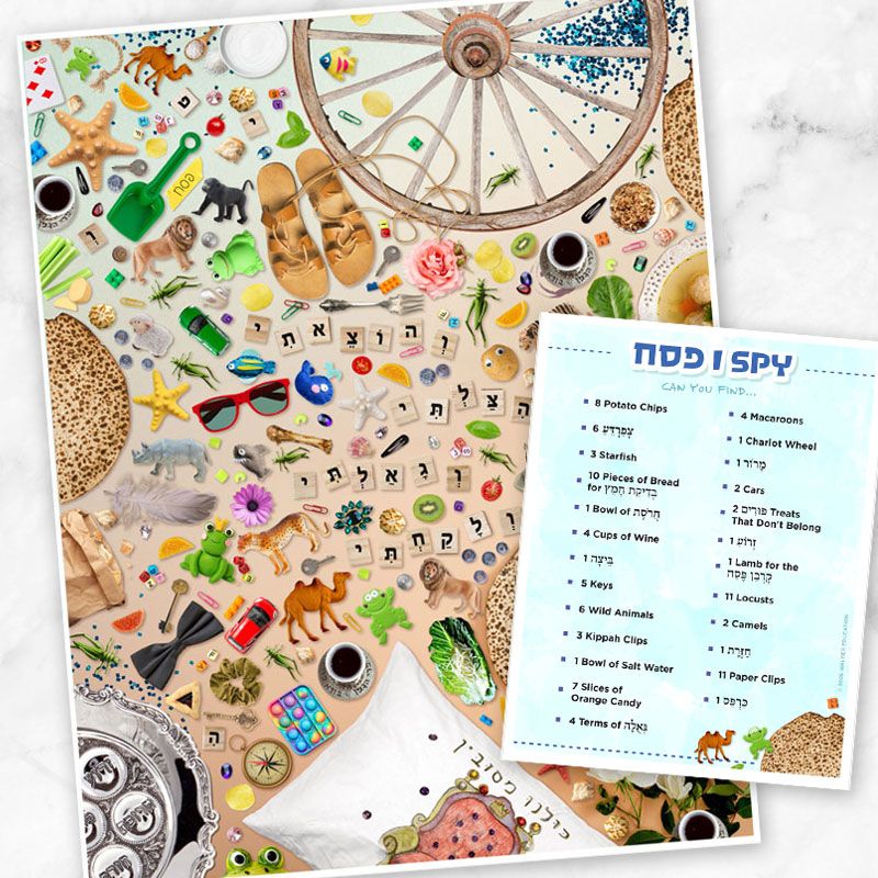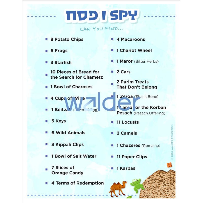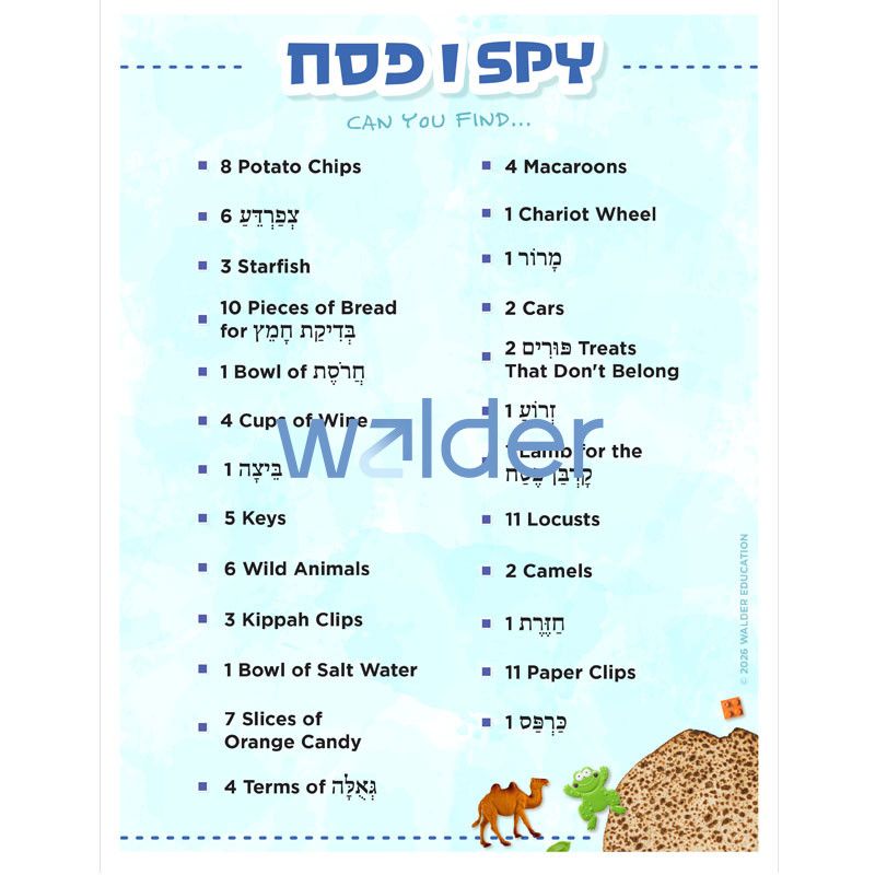 Add excitement and fun to the study of Pesach with this clever I Spy activity. The poster features images of many of the basic objects, practices, and concepts relevant to Pesach, including Seder items, the 10 plagues, and more. Display the poster as an engaging review activity for the class, and to spark discussion about the purpose and meaning of Pesach.