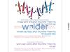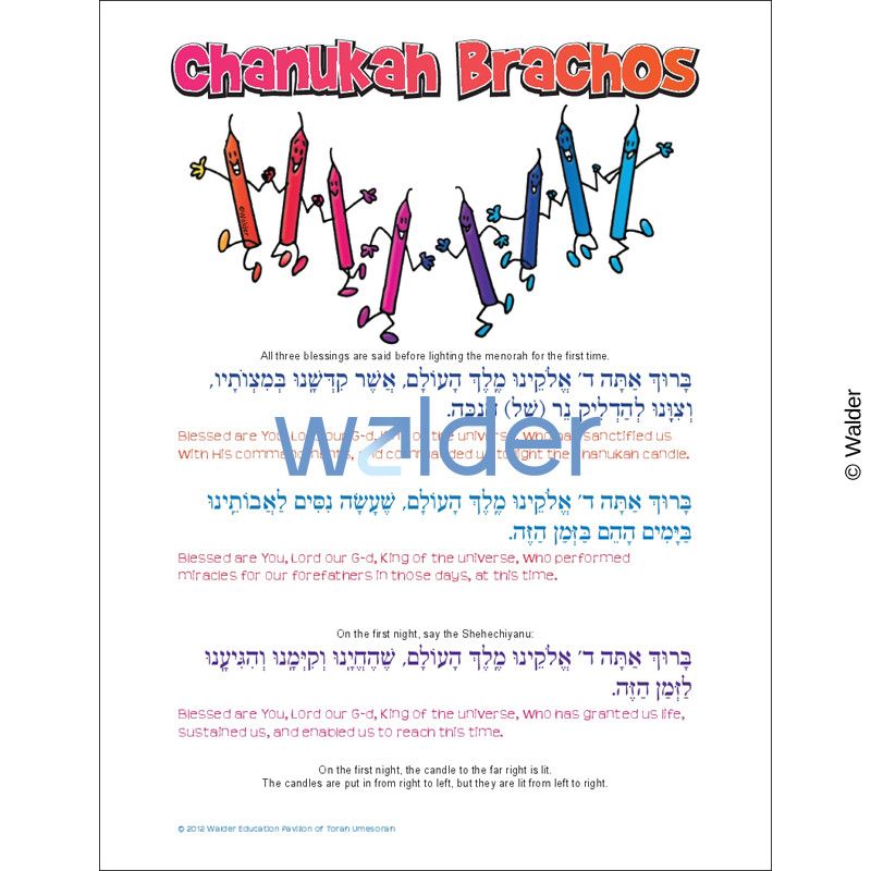 Sign featuring multicolored, dancing candles at the top. Beneath it are the different brachos said while lighting the menorah. Each brachah is in Hebrew with the English translation beneath it. The words ‘Chanukah Brachos’ are across the top in large, red and orange letters.