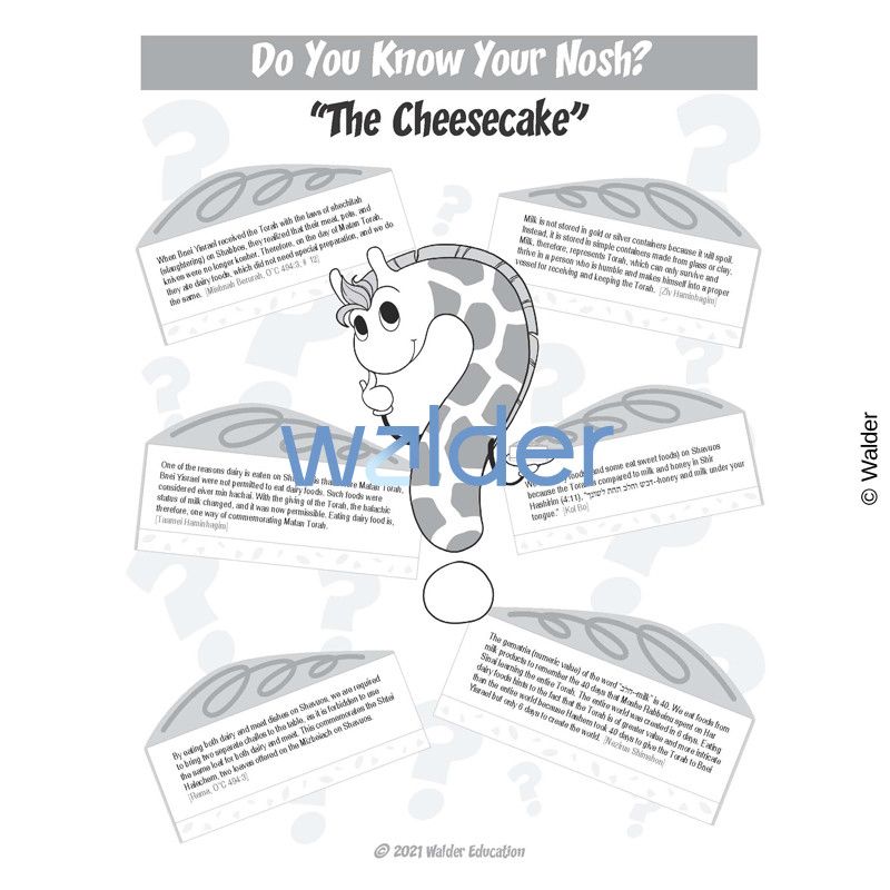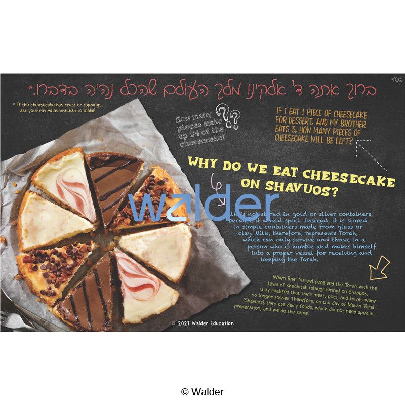 This cheesy placemat will provide fun as the students try any number of combinations of wedges to create a whole cake, while also reminding them why we eat dairy on Shavuos.