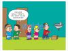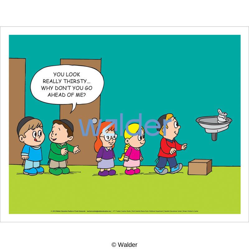 Poster featuring a picture of several children lined up at a water fountain. There are two boys at the back of the line, one is gesturing with a speech bubble above his head that reads ‘You look really thirsty… Why don’t you go ahead of me?’.
