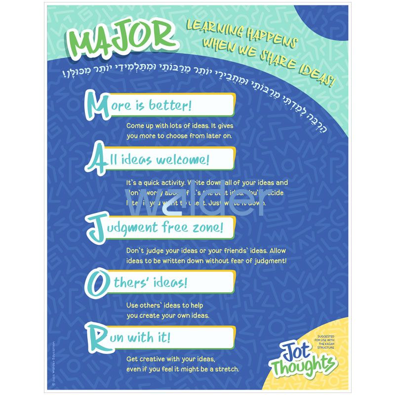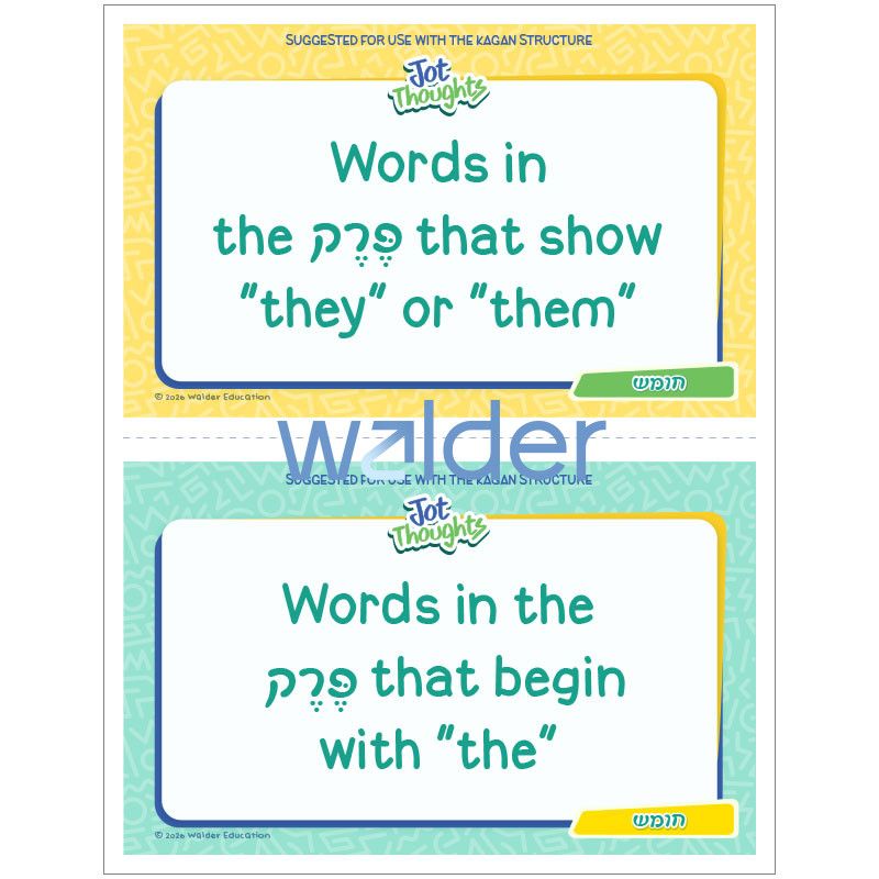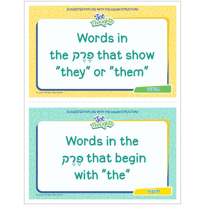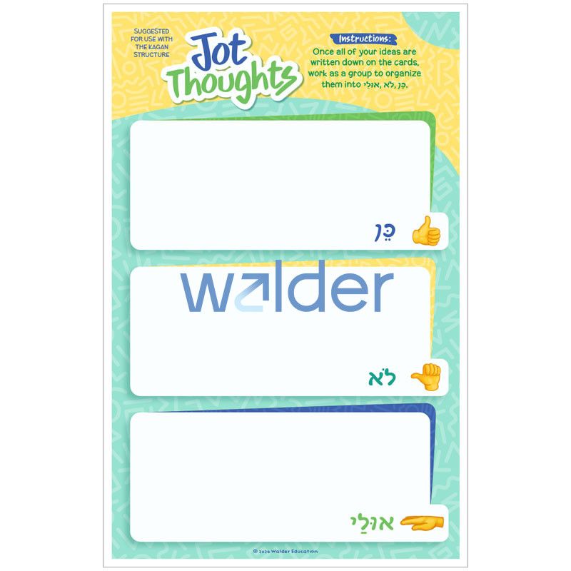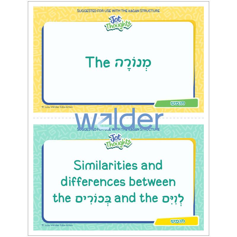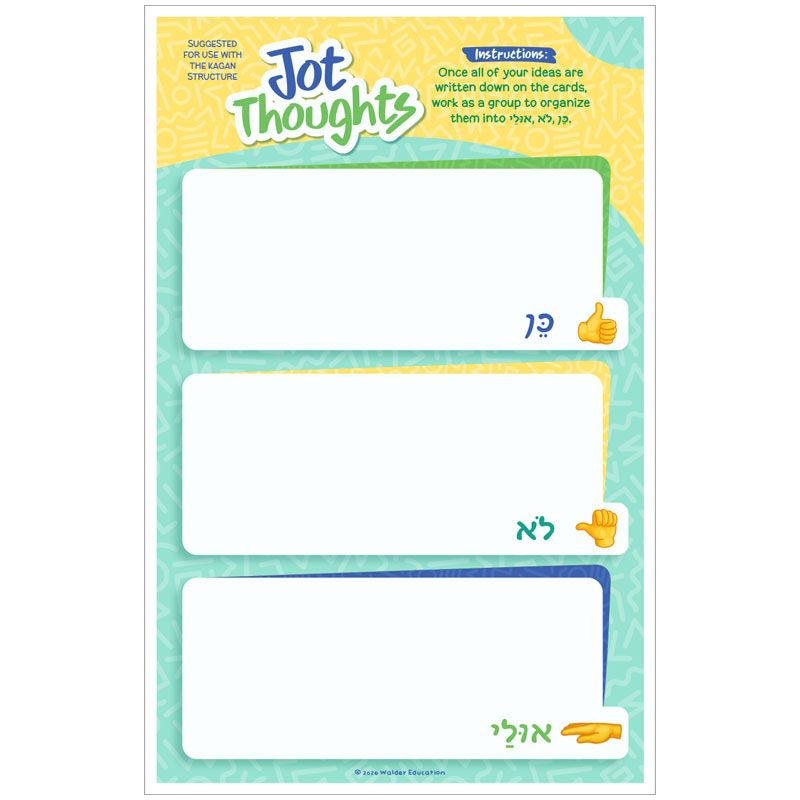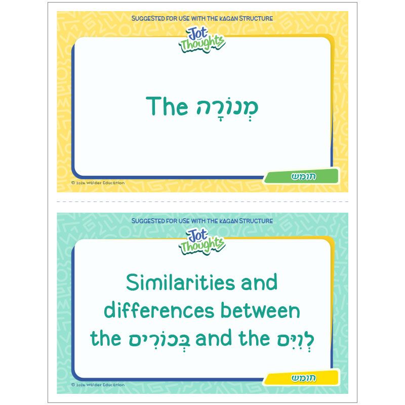 Increase student participation while reviewing Chumash with this brainstorming activity featuring a set of review topic cards for the 8th perek of Bamidbar. Have students work in small groups and use the accompanying slip cards to record their responses to the topic cards. Then, students can use the accompanying mat to sort their responses into 3 categories–כן (yes), לא (no), or אולי (maybe). A poster with positive tips for encouraging each other’s ideas is also included.