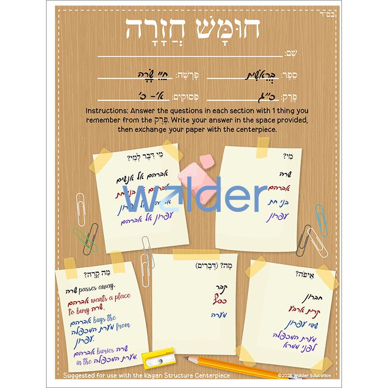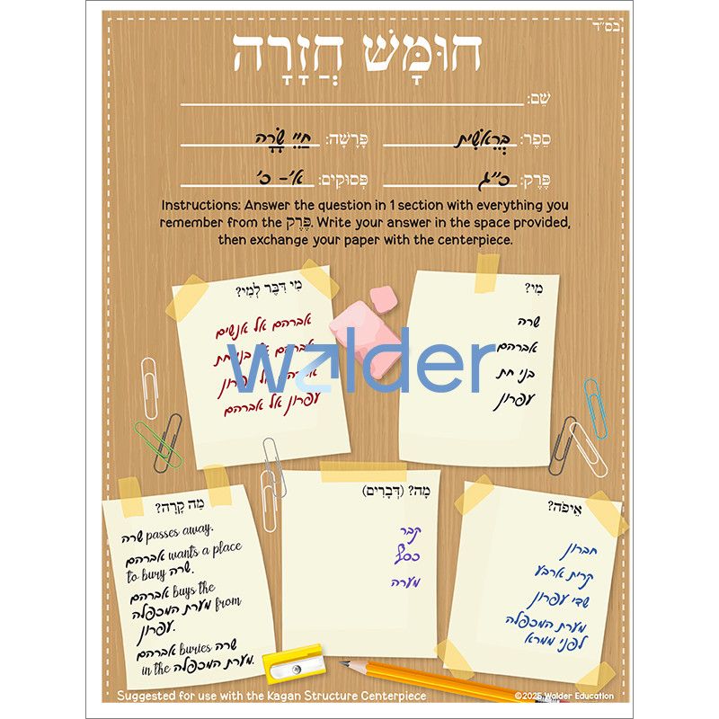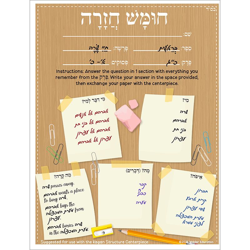 Increase student participation while reviewing Chumash with this collaborative activity. Have students work in groups of 4. Give each student a copy of the activity sheet and place an additional copy in the center of each group. Students write answers to questions about the perek as directed by the instructions at the top of the activity sheet and then exchange it for a sheet in the center, continuing to write answers and exchange sheets until a predetermined time.