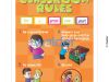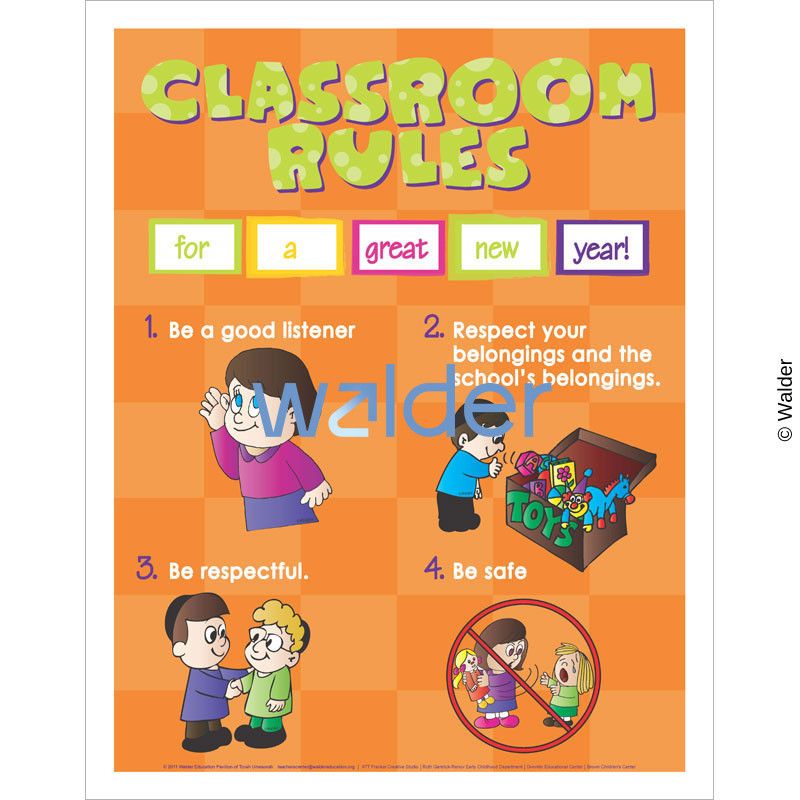 Poster featuring four different classroom rules. Each rule has a number and a picture underneath the text that represents that particular rule. At the top in a polka dotted font it says ‘Classroom Rules’, with the words ‘for a great new year’ in smaller type underneath it in five rectangles. The poster has an orange checkered background.