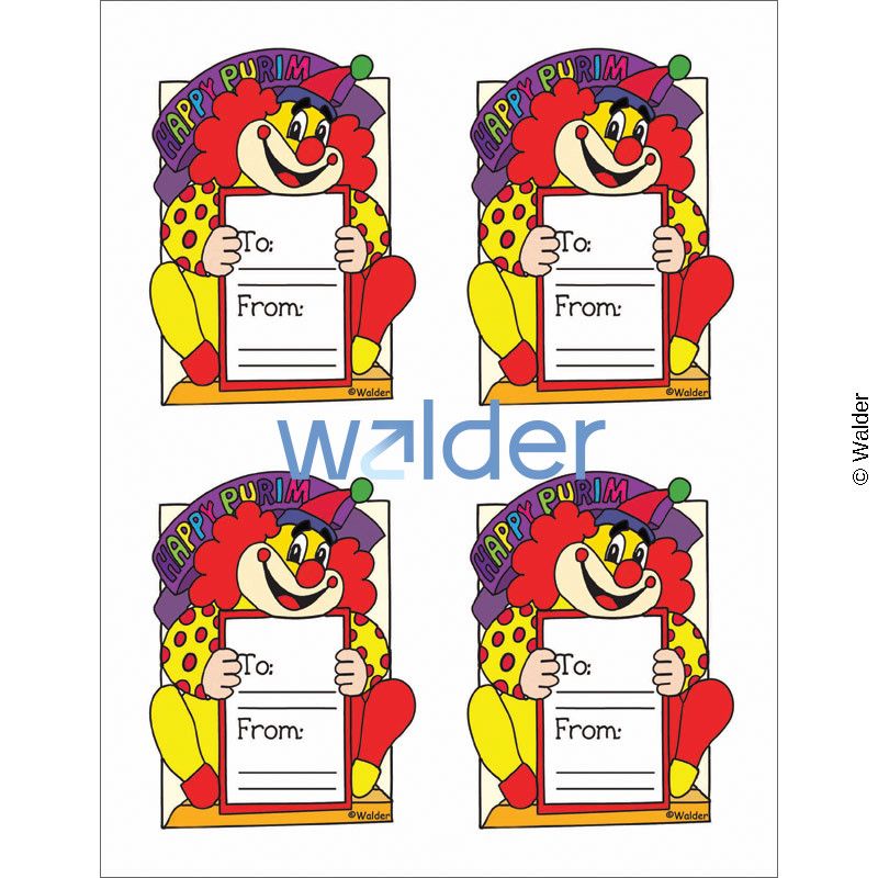 Festive card to e accompany mishloach manos. Card is adorned with a picture of a jolly clown and provides a place to personalize with a line for “to” and one for “from”.