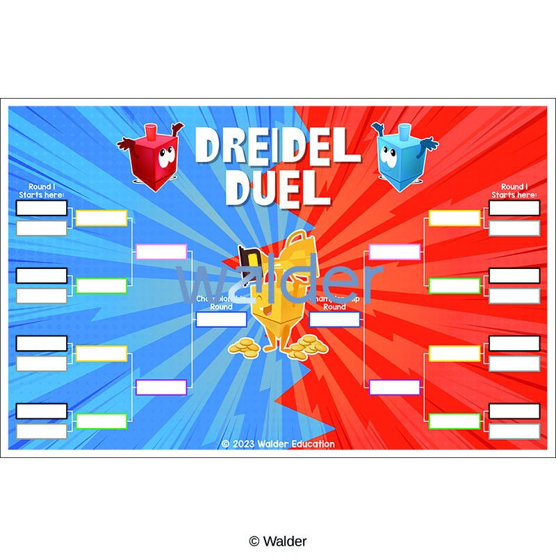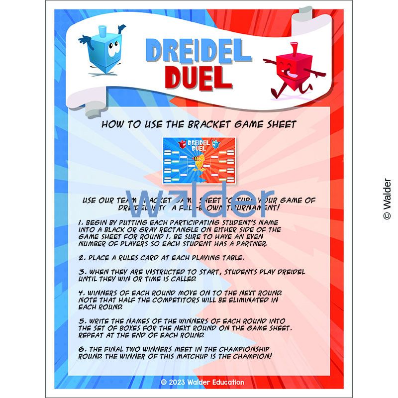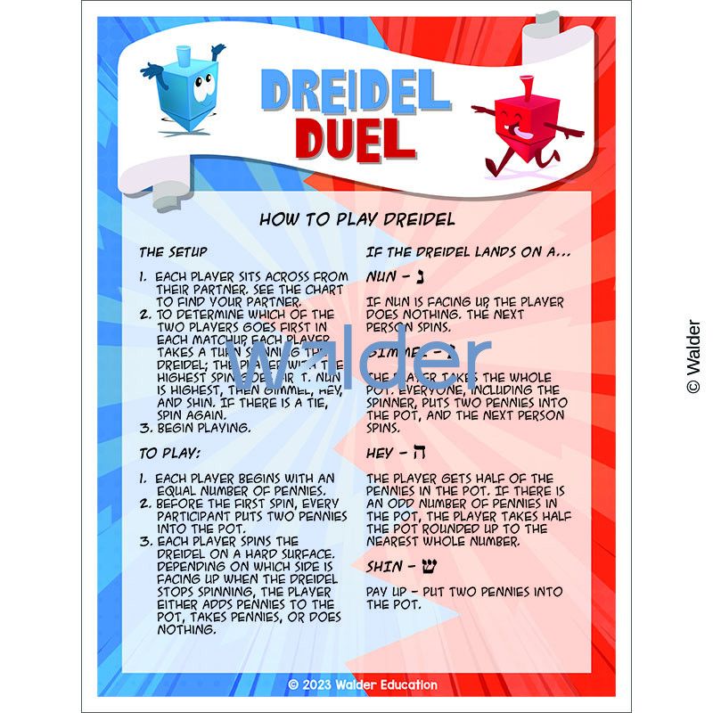 Turn playing Dreidel into an epic tournament with this entertaining Dreidel Duel game. Teach about Dreidel to students unfamiliar with the beloved Chanukah pastime and stir new excitement to play Dreidel for students who may feel it’s all too familiar. Students will face off against each other in a game of Dreidel, with the winners of each round going on to play each other. After three rounds of play, two finalists will face off to win the title of Champion Dreidel Player. The accompanying instructions sheet clearly explains the rules and everything students need to know to play Dreidel Duel. Use for in-school Chanukah celebrations or as a reward for good behavior.