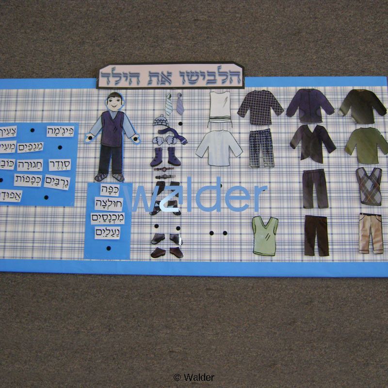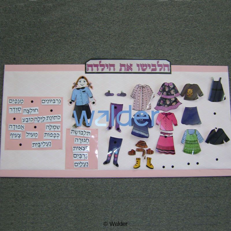A dress the doll interactive bulletin board for boys. Featuring a variety of clothing for students to put on the doll. Students will learn and internalize the Hebrew words for clothing while dressing the doll and labeling the clothing they put on her. This activity can also be reconfigured and used as a file folder game or poster.