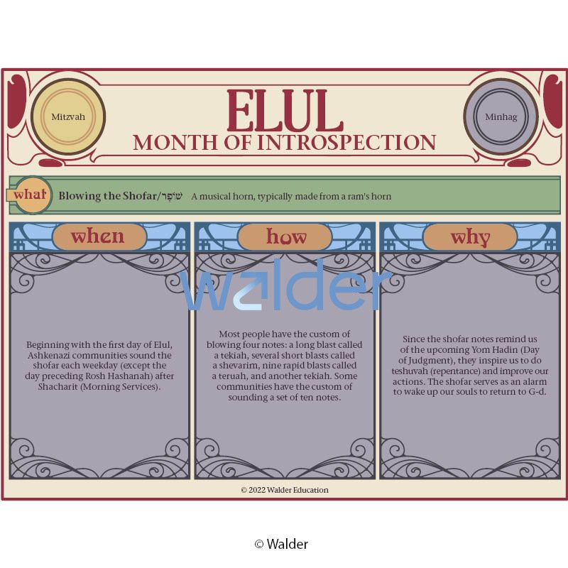 Perfect for Hebrew Schools, this holiday handout contains everything you need to know about Elul. Familiarize yourself, your students, and your congregants with the significant aspects and practices of the month leading up to the High Holidays.