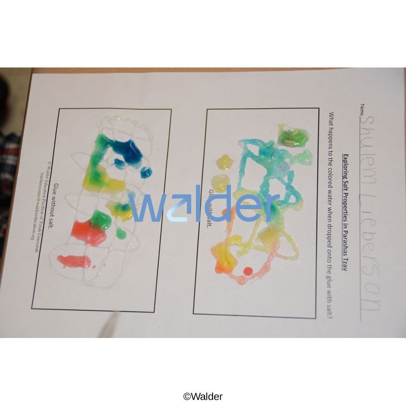 The Torah prohibits the consumption of blood. Salt is used to draw blood out of the meat in the koshering process before the meat can be consumed. In this art and science experiment, the students will observe salt soaking up moisture. They will sprinkle salt onto a white glue design and drop colored water onto the salt and observe the reaction.
