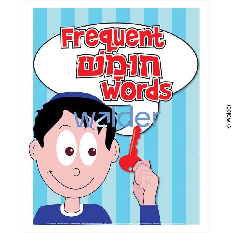 Poster featuring a boy holding a key saying,’Frequent Chumash Words’ and a sheet of keys to be cut out. Chumash words for review can be written on the keys by the students or teachers and placed around the poster. These keys can also be taken off of the board and used as flashcards for review.