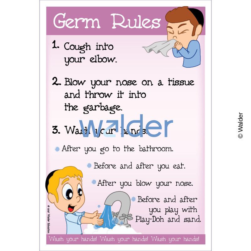 Promote the science of health and wellness in the preschool classroom by using this rule poster to remind students of appropriate behavior regarding germs, so they don’t spread. Students are reminded to cough into their elbows, blow their noses into a tissue and throw it away, and wash their hands after going to the bathroom, after blowing their noses, and before and after eating, or playing with play-doh and sand.
