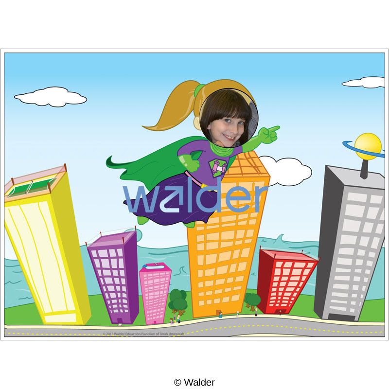 This 3-D panel display of a girl “Torah Superhero” is ideal for photo opportunities at school functions and celebratory events. Here is a creative and fun way to inspire students to feel pride in the Torah heritage. The students stand behind the board and, with their head put through the hole, their picture is taken. The picture can then be included in any greeting card or class newsletter to parents or distributed at a carnival. This allows the students to take ownership of the item and what it means thereby enhancing their appreciation of being Jewish.