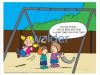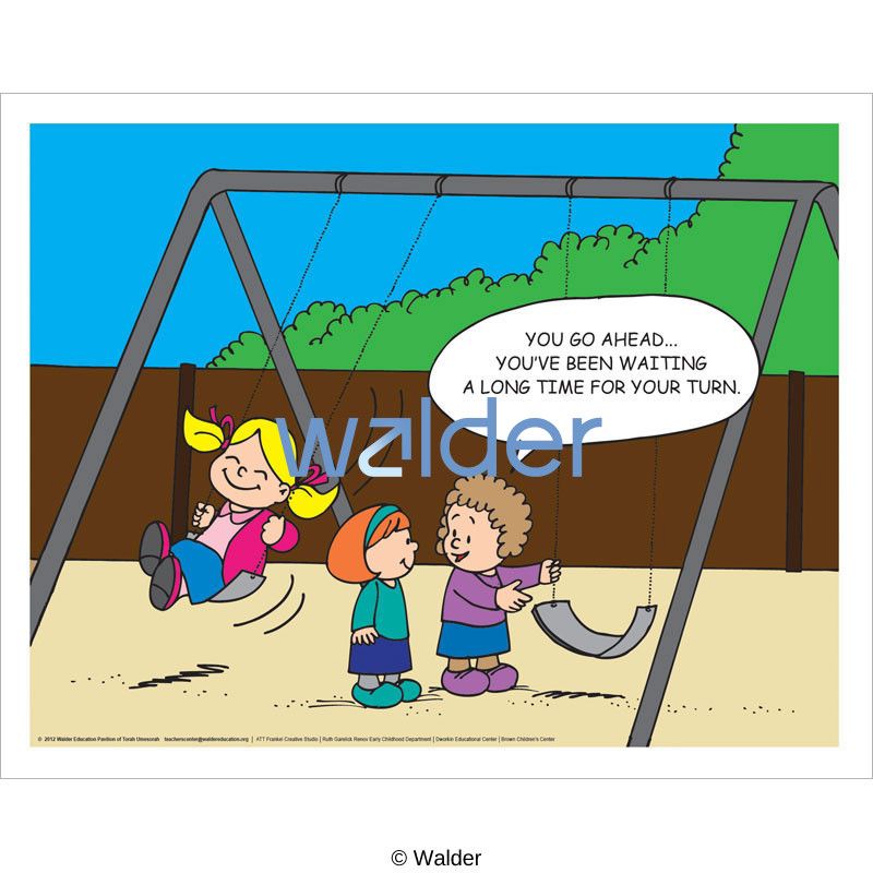 Poster featuring a picture of three girls, one is swinging on a swing set, the other two are standing by the empty swing. One of those girls has a speech bubble that reads ‘You go ahead… you’ve been waiting a long time for your turn’.