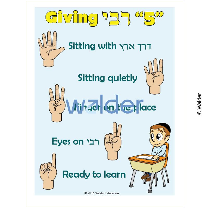 Countdown to student readiness with this Giving Rebbe Five procedural sign. When the teacher calls for student attention, he raises his hand and begins to count backwards. At five, students return to their seats with derch eretz. At four, they sit quietly. At three, they have their finger on the place. At two, they have their eyes on Rebbe, and by one, they are ready to learn.