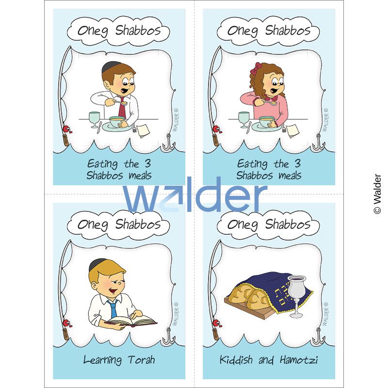 Reinforce fluency in the observance of Shabbos with this exciting go fish style card game. The cards feature fully-labeled visual illustrations of what to do and what not to do to observe Shabbos properly. From calling Bubby before Shabbos to avoiding selecting the bad from the good, students will gain and review with impressive detail the many activities we do or don’t do on Shabbos. This game includes a full deck of 2-sided cards and instructions for how to play.