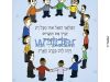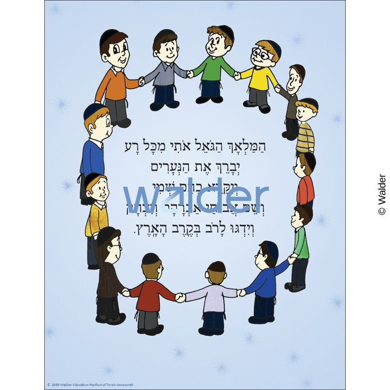 Sign featuring boys in a circle holding hands on a starry blue background. In the middle of the circle are the words for ‘Hamalach Hagoel’ in black hebrew type.