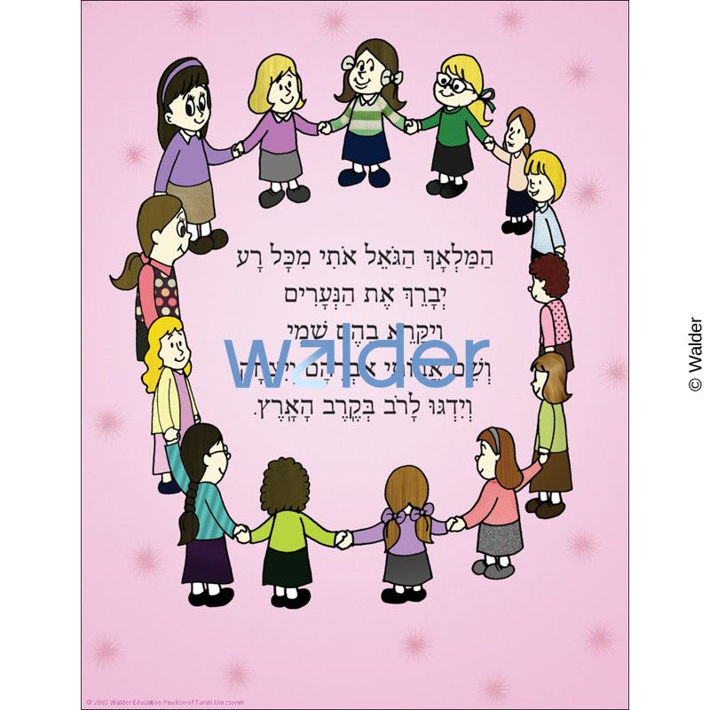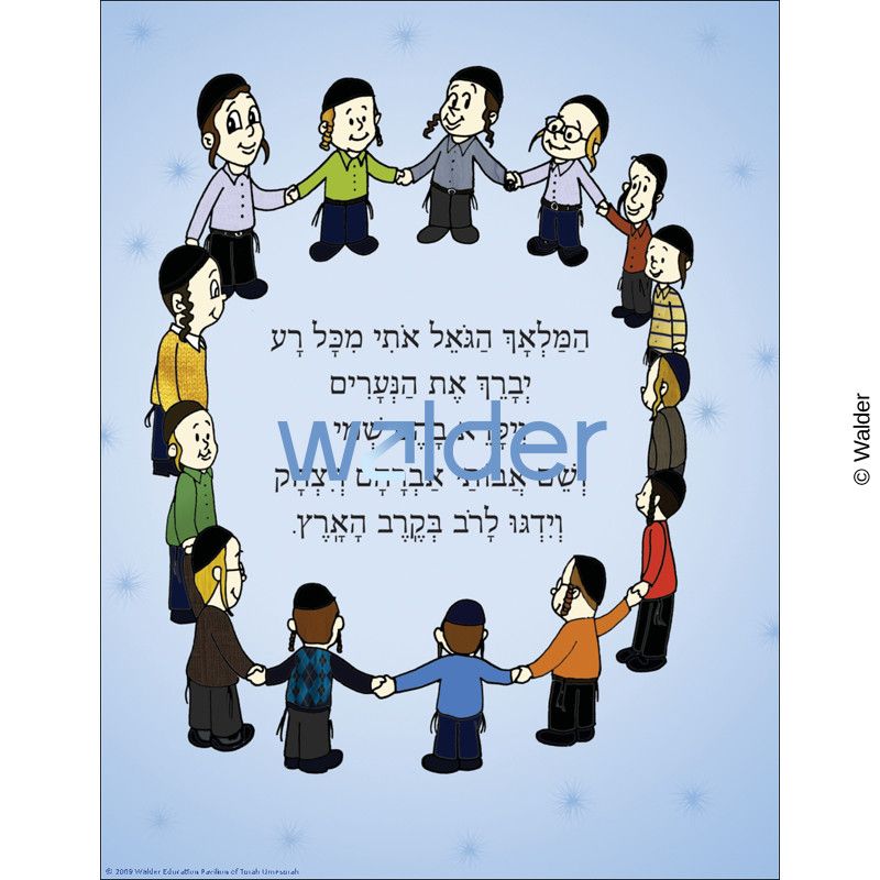 Sign featuring boys in a circle holding hands on a starry blue background. In the middle of the circle are the words for ‘Hamalach Hagoel’ in black hebrew type.
