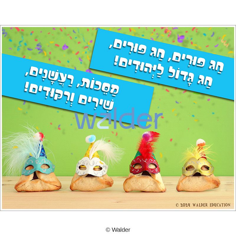 Set the perfect Purim mood in your classroom with this fun–and funny!–poster. The poster features the Hebrew lyrics of one of the most beloved Purim songs over images of hamantashen wearing masks. Use this poster as a springboard to discuss the meaning behind the custom of wearing costumes on Purim, eating hamantashen, and the role of light-hearted humor in celebrating this unique holiday.