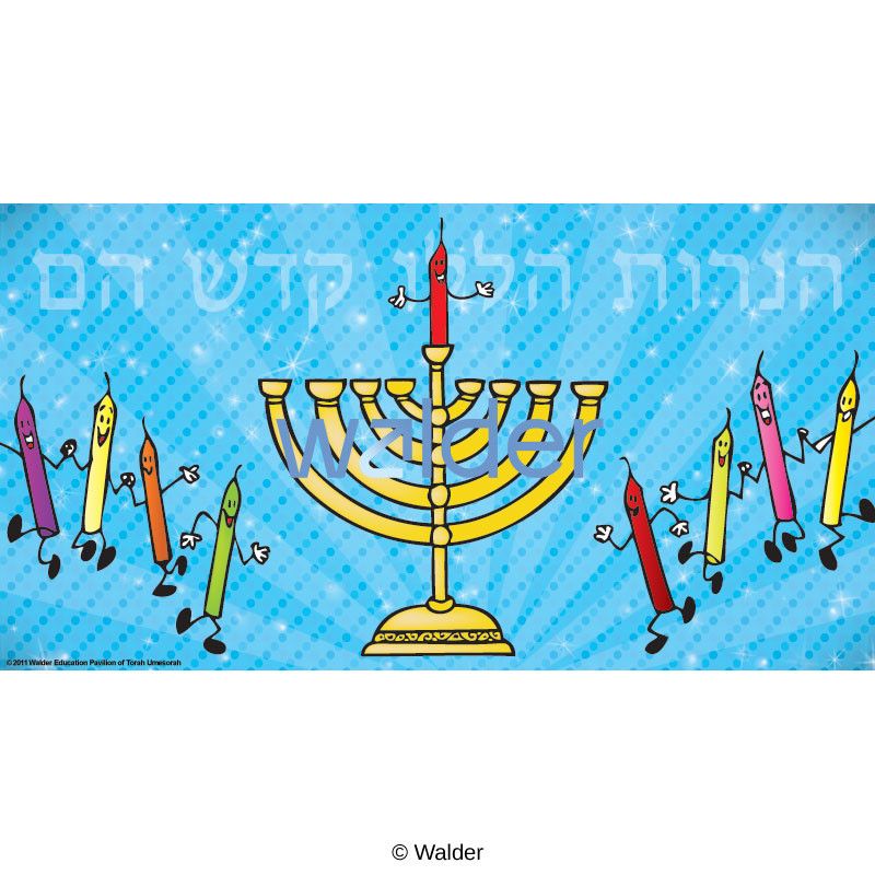 A Chanukah banner featuring a menorah and candles and titled with the words ‘haneiros hallalu kodesh hem’.