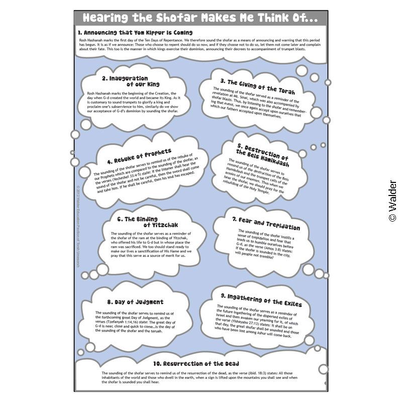 Let the young boy envisioning ten different scenes that the sound of the shofar can conjure in the mind, help your students do the same. Included are detailed descriptions that students can match with the images to demonstrate their familiarity with the kavanos they can have while listening to the sound of the shofar on Rosh Hashanah.