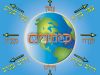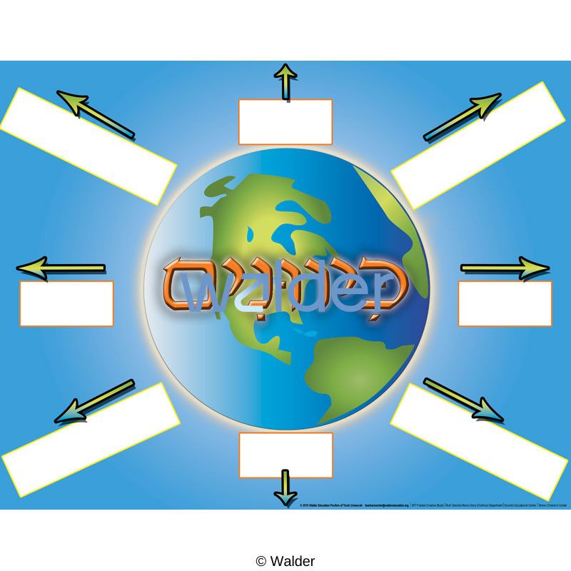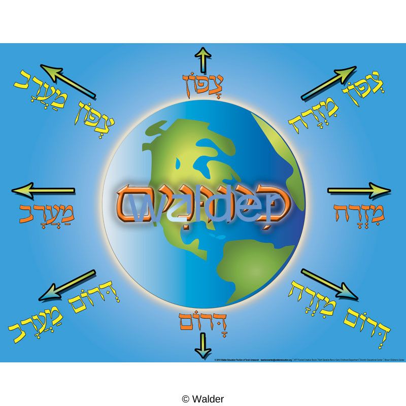 Poster featuring a picture of the earth on a blue background surrounded by the words for the directions in Hebrew, each with a corresponding arrow. The word ‘??????’ is printed in large, print lettering across the globe.