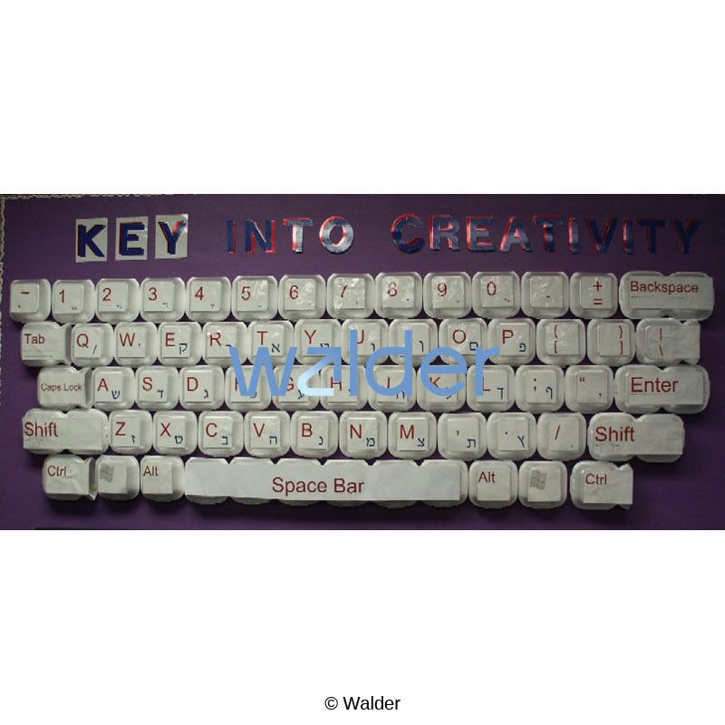 A bulletin board made out of take out boxes made to look like a Hebrew keyboard. This bulletin board is ideal for a computer lab and will help students master their typing skills.