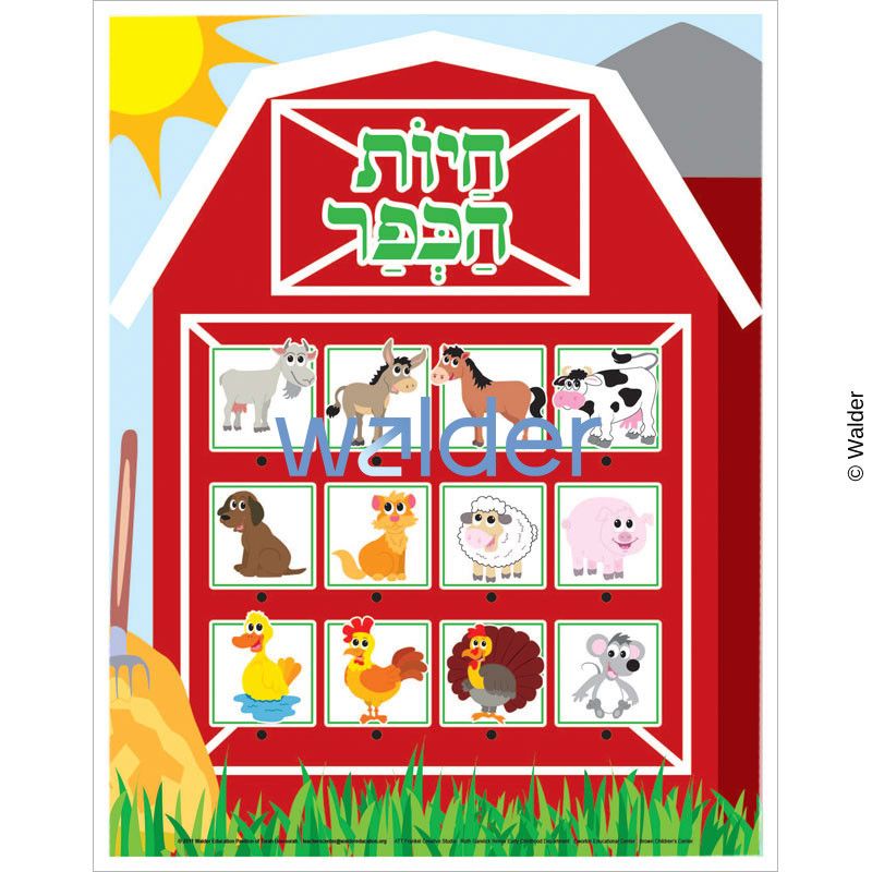 Hebrew poster featuring pictures of 12 farm animals, in three rows of four, each inside a yellow box. Underneath each box is the animal’s name in Hebrew.