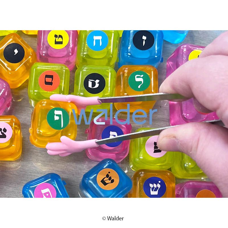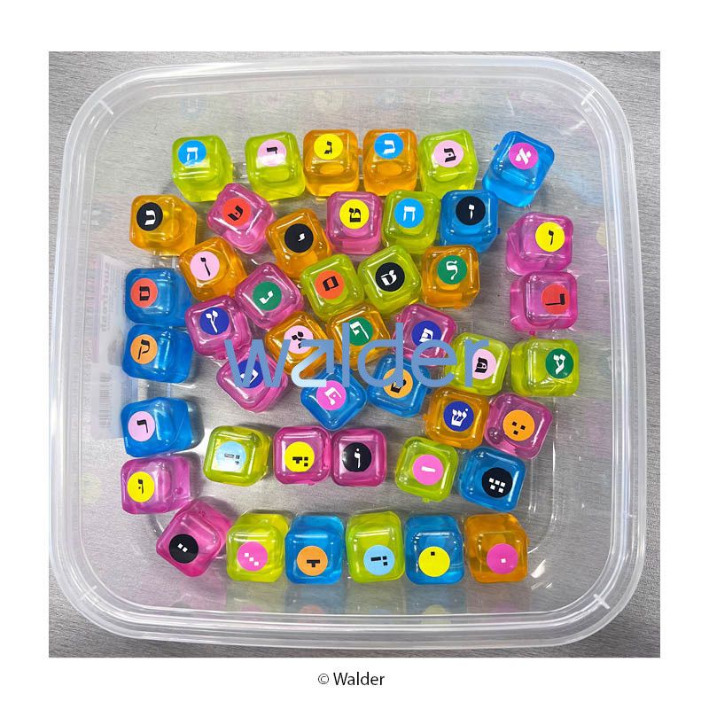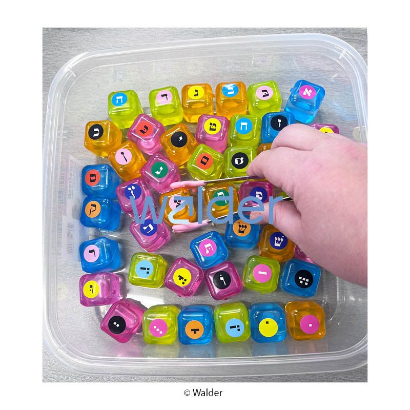 Engage students in this multisensory activity to help them review and sharpen their Alef Beis skills. Students manipulate fun, child-sized tongs to sort small plastic cubes labeled with Hebrew letters and vowels. Using the Alef Beis and nekudos chart (HOALF13-RL021) as a guide, students can match the letters or nekudos on the cubes to those on the chart or spell out simple Hebrew words. For an additional sensory element, freeze the cubes and use them cold.