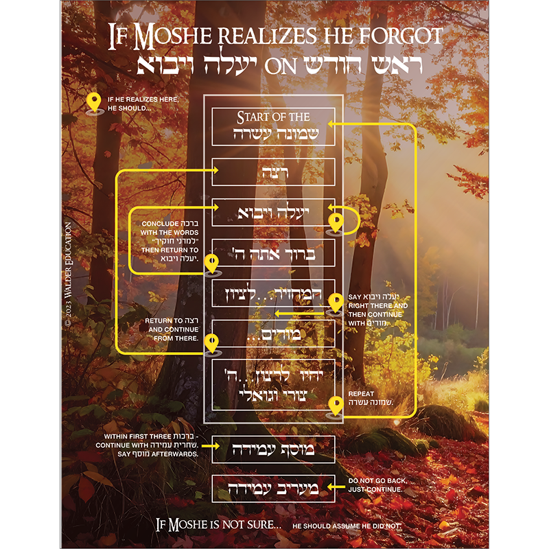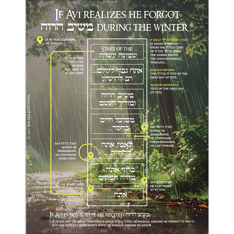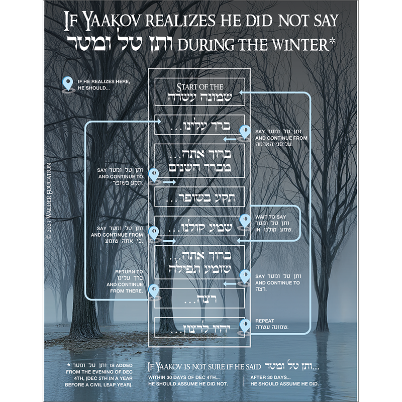 Summarize a complex, frequently needed topic in halacha into a concise flowchart with this visually stunning poster. The flowchart depicts different points in davening and what steps to take if Vesain Tal Umatar is not said during the appropriate winter period. The calm, scenic artwork and clear, visually intuitive presentation are designed to teach this important topic and can help reduce the anxiety students may feel if they make an error with Vesain Tal Umatar. This graphic poster can be used in the classroom during instruction or placed in a central location for reference during davening. It can also be reduced and printed as a helpful handout.