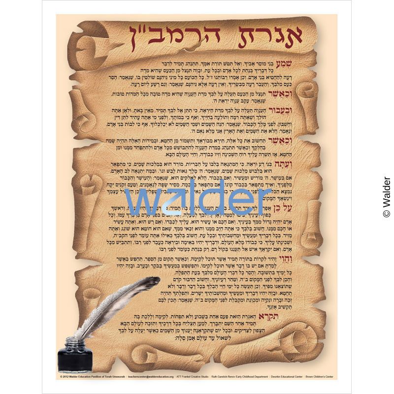 The letter of the Ramban to his son imparts wisdom for everyday living. The concepts contained within it are the backbones of Jewish ethics. In this poster the text of the Igeres HaRamban is displayed on an antique scroll and is suitable for hanging in the classroom.