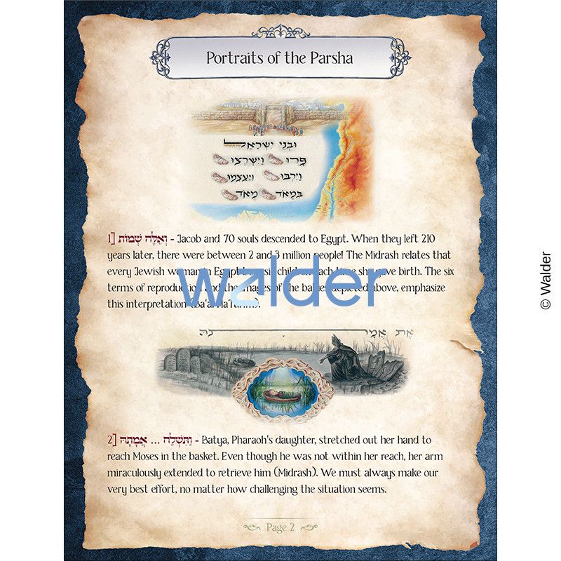Each parsha booklet includes a summary of the parsha, the unique Portraits of the Parsha, which are visual interpretations of the text with associated commentary, messages from the parsha, reflections, and discussion questions.