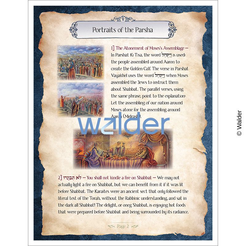 Each parsha booklet includes a summary of the parsha, the unique Portraits of the Parsha, which are visual interpretations of the text with associated commentary, messages from the parsha, reflections, and discussion questions.
