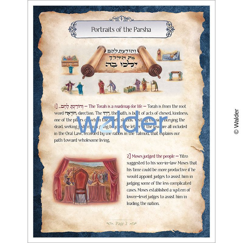 Each parsha booklet includes a summary of the parsha, the unique Portraits of the Parsha, which are visual interpretations of the text with associated commentary, messages from the parsha, reflections, and discussion questions.