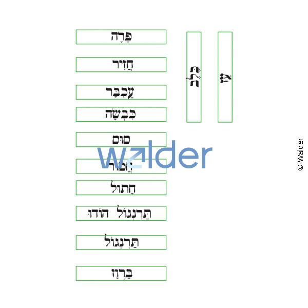 Hebrew poster featuring pictures of 12 farm animals, in three rows of four, each inside a yellow box. Underneath each box is a dot for adhesive for putting the Hebrew name of each animal. The second page has rectangles with each Hebrew word you need.