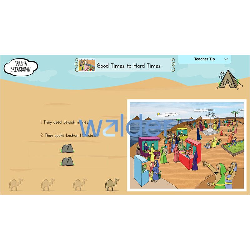 Maximize engagement and make parsha study come alive with our groundbreaking Interactive Parsha. The entire parsha, along with selections from the Midrash and Rashi, is covered in a series of interactive slides with easy-to-read text supported by our popular parsha pictures. Included are fill-in-the-blanks, vocabulary, games and activities, and review and discussion questions. Interactive Parsha can be used with any interactive display, projector, or laptop and comes with a user guide, a question-and-answer key, and a template for creating your own take-home parsha question sheet.