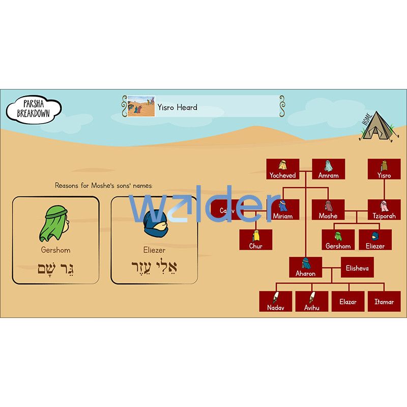 Maximize engagement and make parsha study come alive with our groundbreaking Interactive Parsha. The entire parsha, along with selections from the Midrash and Rashi, is covered in a series of interactive slides with easy-to-read text supported by our popular parsha pictures. Included are fill-in-the-blanks, vocabulary, games and activities, and review and discussion questions. Interactive Parsha can be used with any interactive display, projector, or laptop and comes with a user guide, a question-and-answer key, and a template for creating your own take-home parsha question sheet.